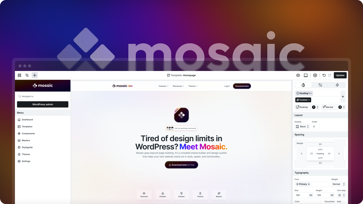 Mosaic goes beyond page building. It’s a complete theme builder and design system that helps your next website stand out in style, speed, and functionality.
