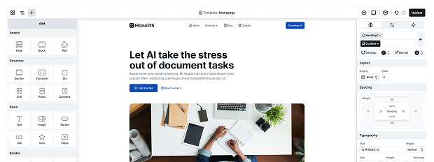 Design your site visually, arranging layouts and styles instantly with drag-and-drop, and enhance it with components and advanced elements.
