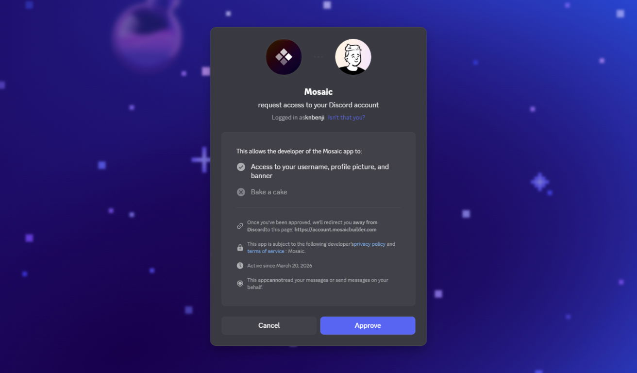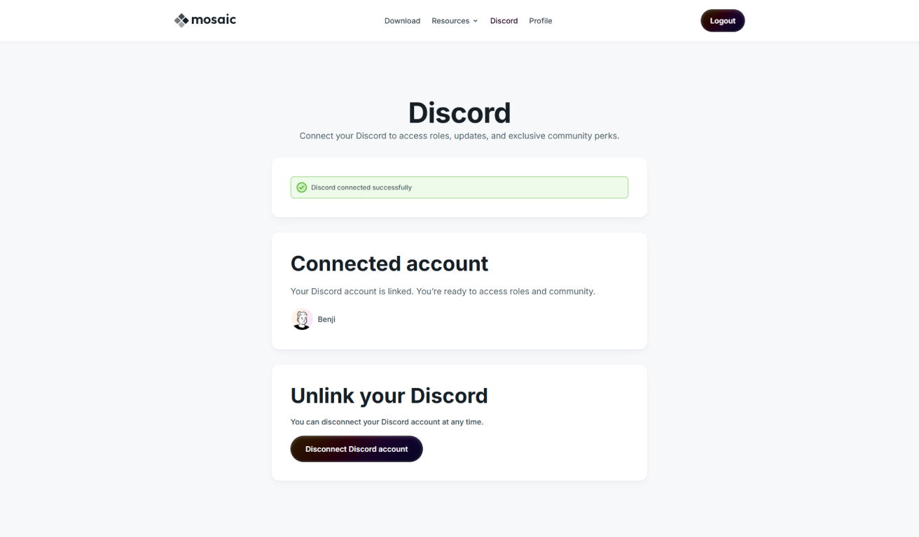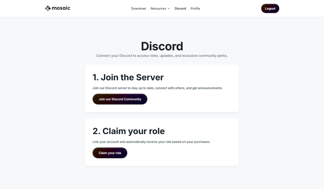 Navigate to the Discord menu on your Mosaic account page, and click Join our Discord Community.