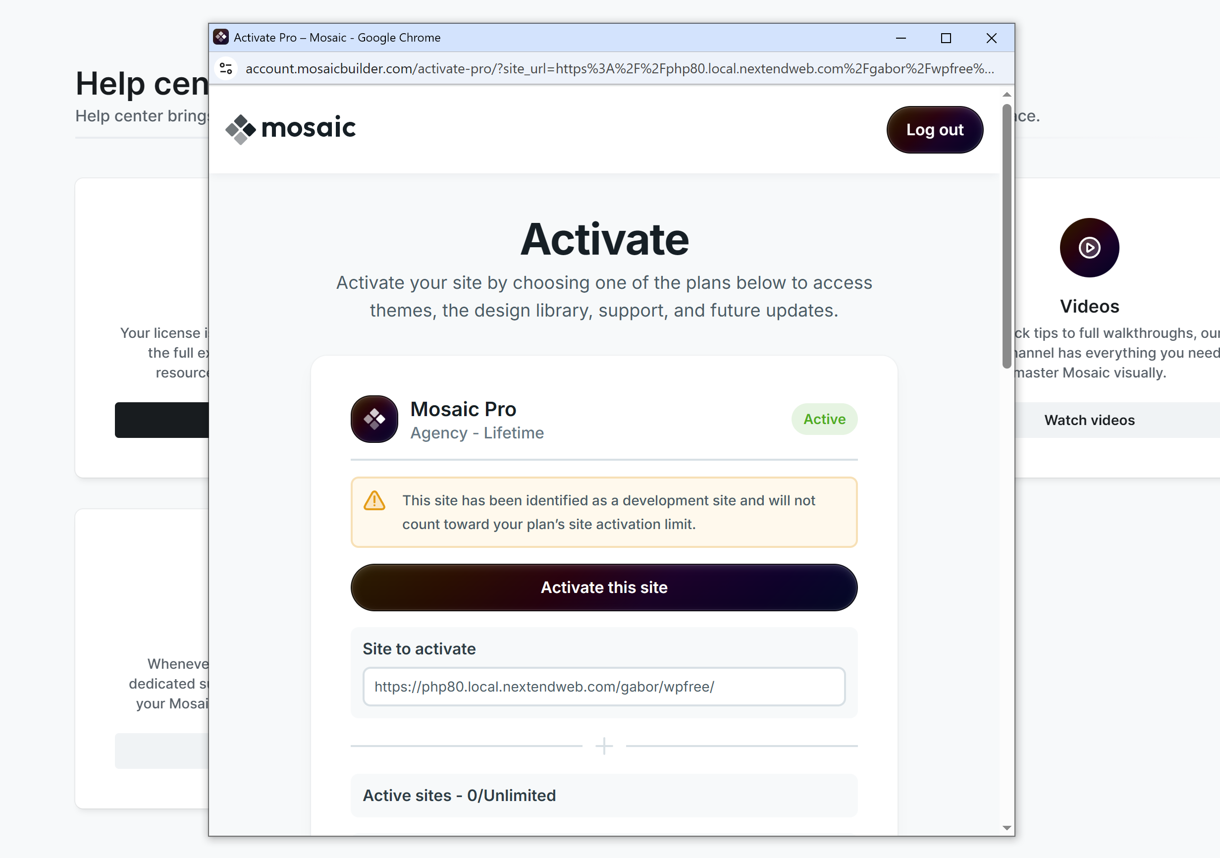 In Mosaic, whitelisted domains let you activate Pro on development and staging sites without using a seat. Localhost and common dev/staging patterns are allowed, so you can work on dev and live at the same time.