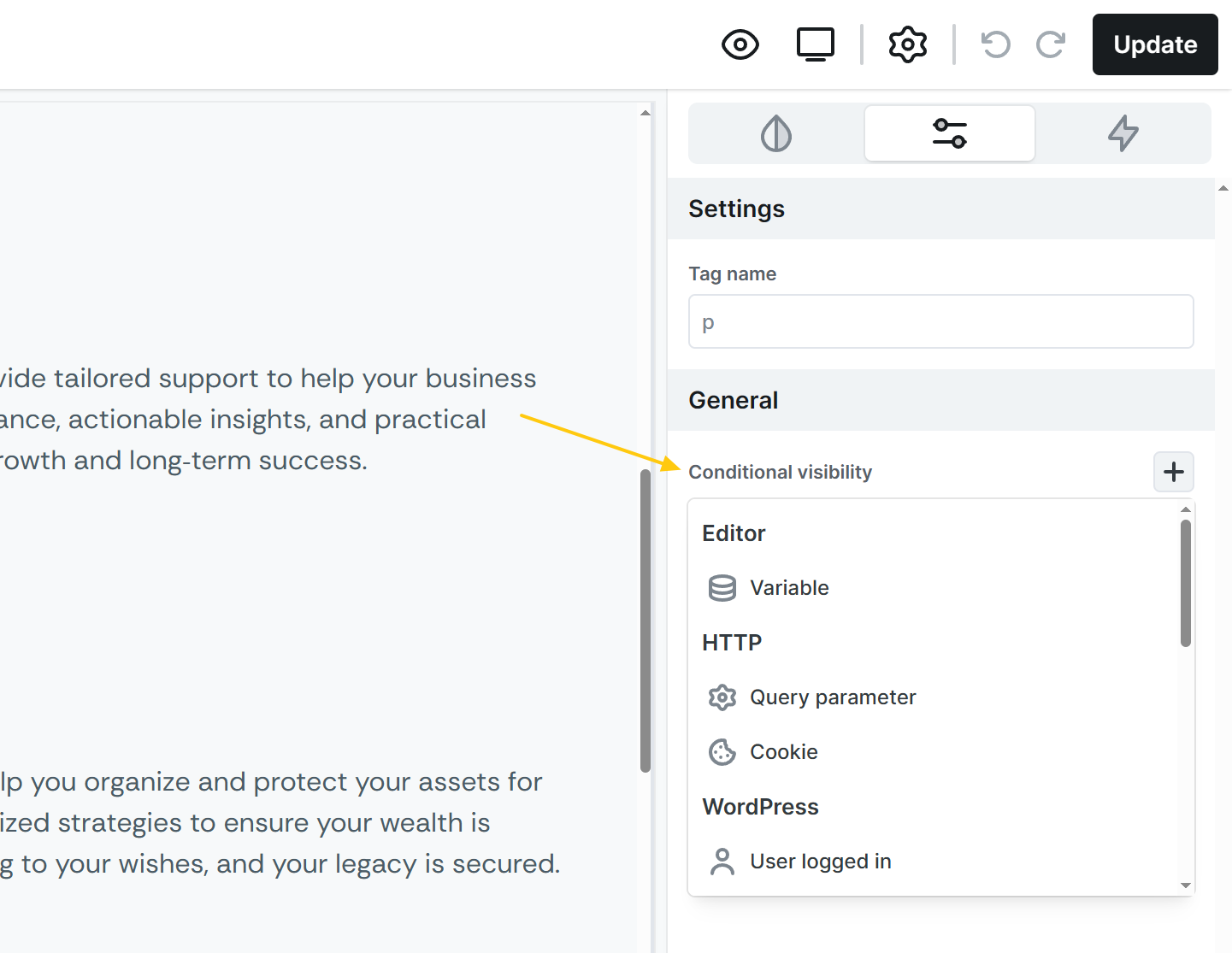 On the Top panel’s right side, you can find essential settings and features that affect the entire Editor. These include the Preview, the Breakpoints, and the Update button, allowing for easy management and control of your work.