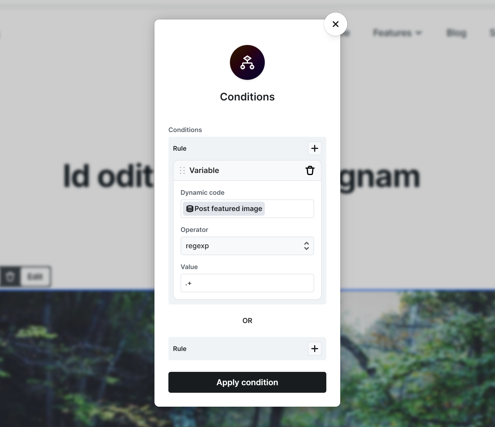 Moreover, if needed, you can set custom conditions to determine when the element should be visible. By clicking on the + icon next to Conditional visibility, you can easily access the Conditions interface, where you can define specific rules tailored to your needs.
