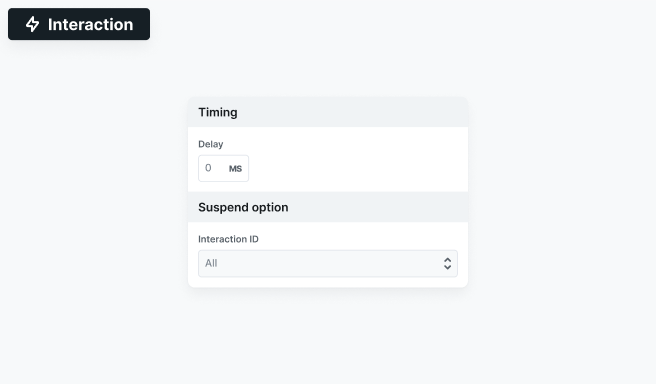 Controls other interactions with three options, Resume, Suspend, or Reset. After choosing one, in the Action tab you can set a delay before it runs. A dropdown lets you apply the action to All interactions or target a specific one by its ID. In the image example, the Suspend option is shown, but each choice displays its own field names in the same way.