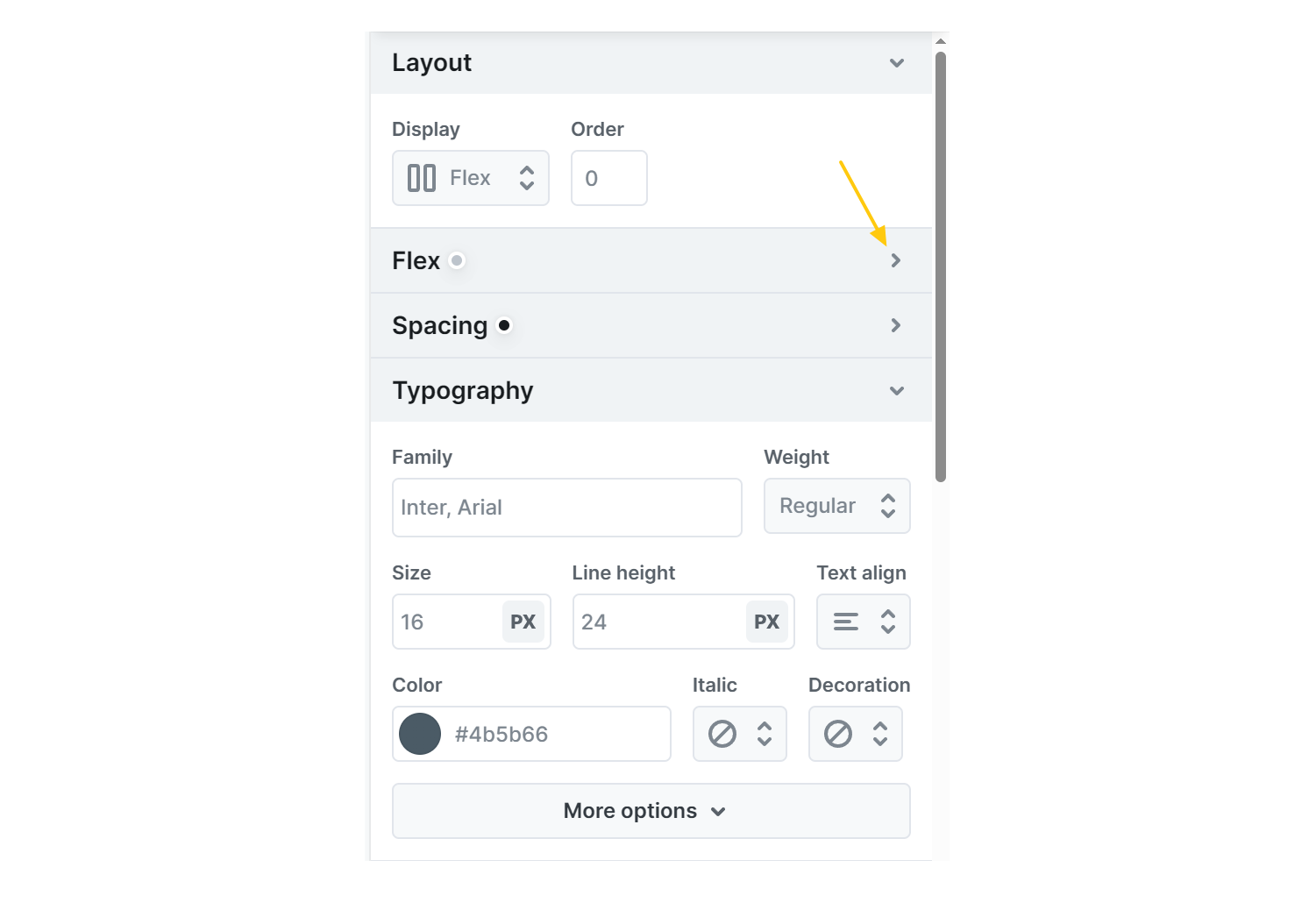 By clicking the gray indicator, you can easily see where the value was inherited from. If you want to make changes, you’ve got two options: you can override the style right on the spot by adding a new value, or go to the original source to edit the value directly.