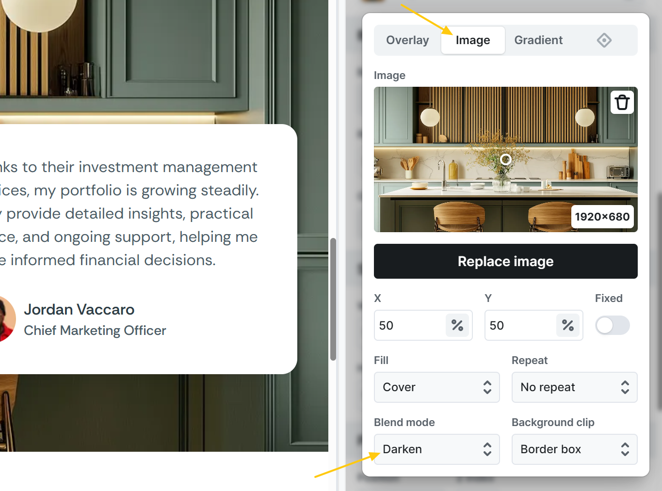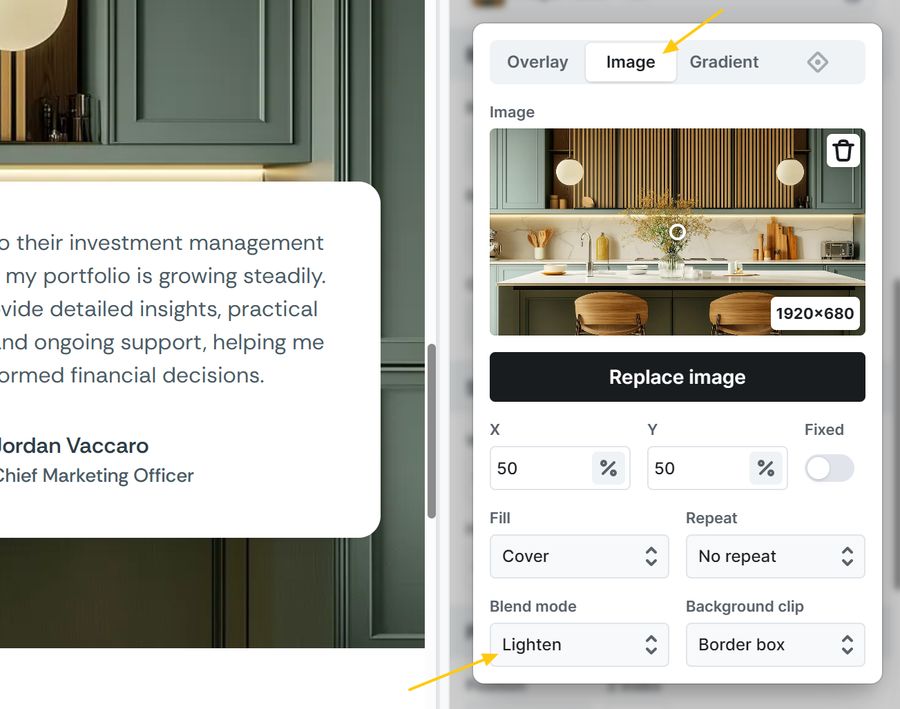 - Blend mode: Control how the content of an element, like text or images, blends with what’s behind it.