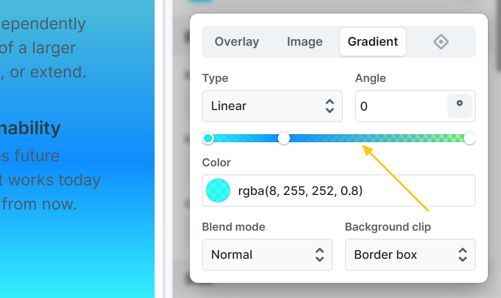 - Angle: Specify in which direction the gradient should flow. Available for the linear type.