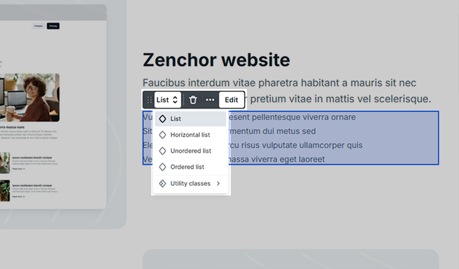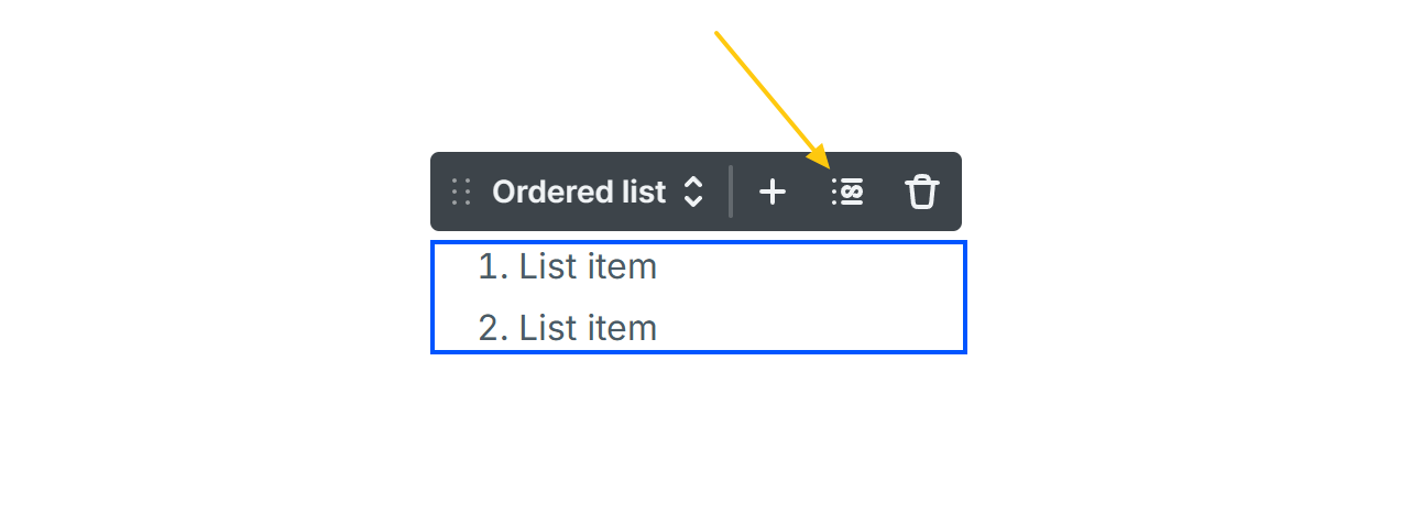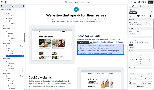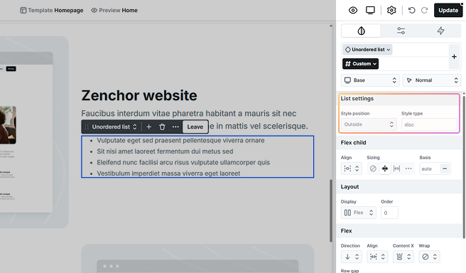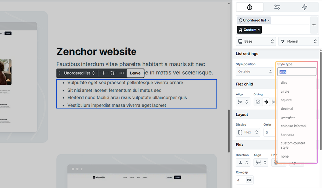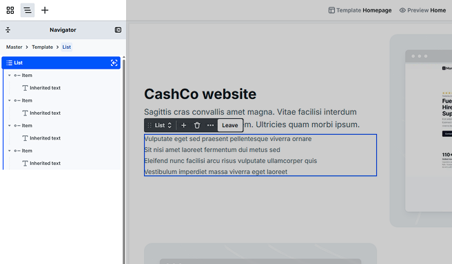 The List element allows you to display structured content in a familiar, list–based format. It works similarly to native HTML lists, but gives you flexibility over layout, styling, and dynamic content through loops.