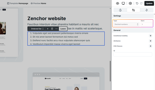 - Type: In the Settings tab, you’ll find the Type option, which lets you define the list marker style (for example, numbers, letters, or Roman numerals).