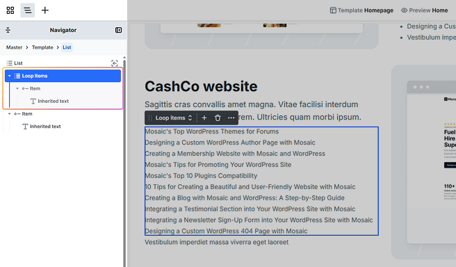 To create loop items, press the Add loop items button on the element’s toolbar.