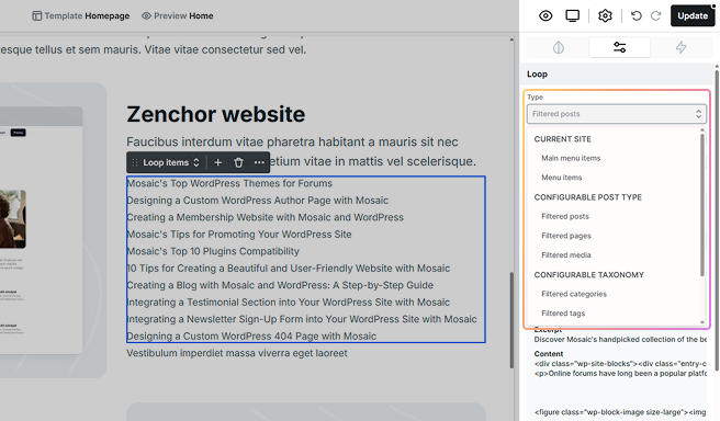 It allows you to pull data dynamically, automatically updating your content. You’ll define a single Item that acts as the template, and all subsequent items will be generated based on this template.