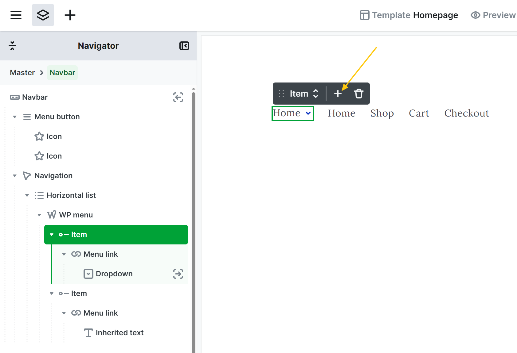 The Navbar includes additional elements that are accessible through the Add panel. For more information on how to use it, refer to the Add panel documentation.