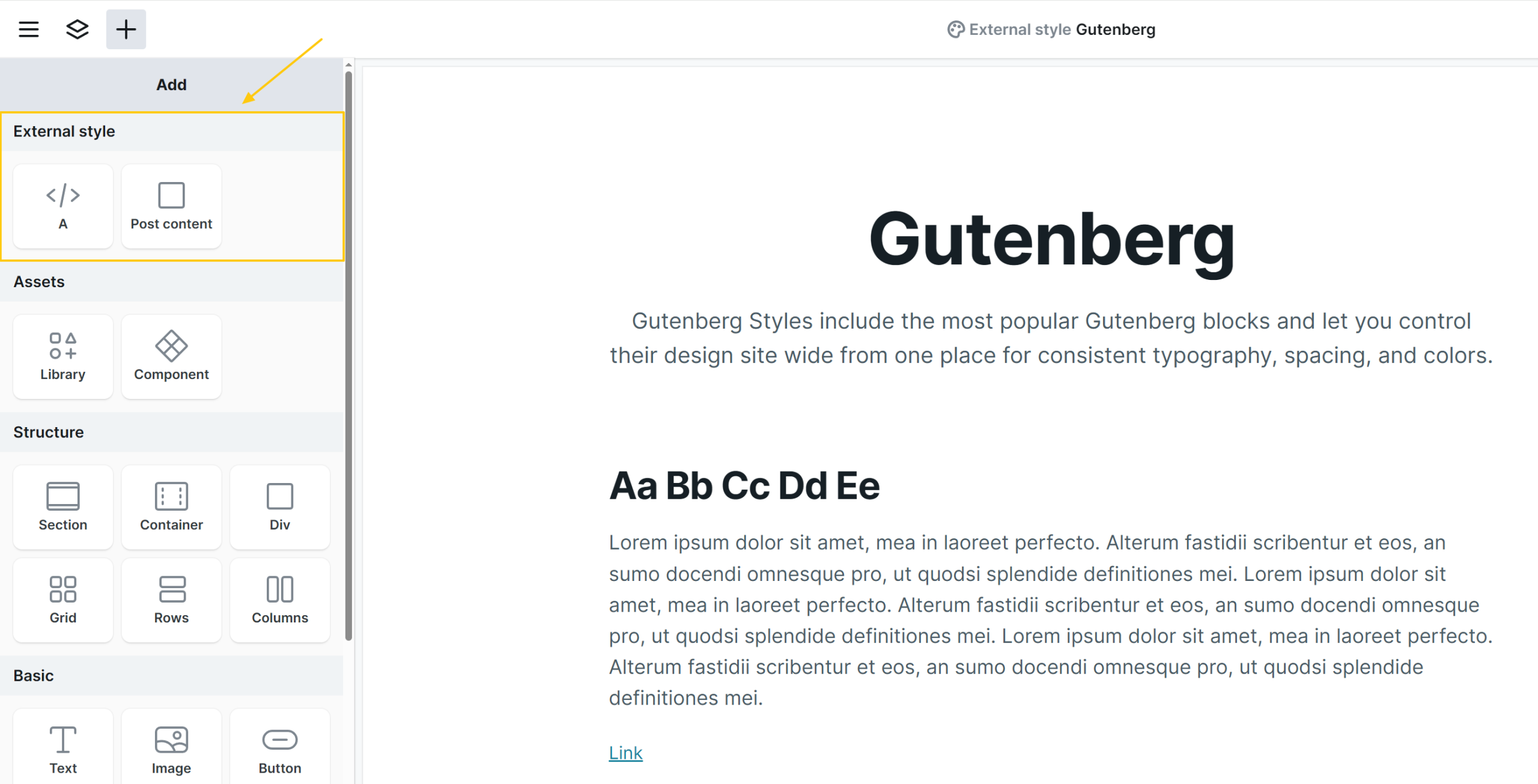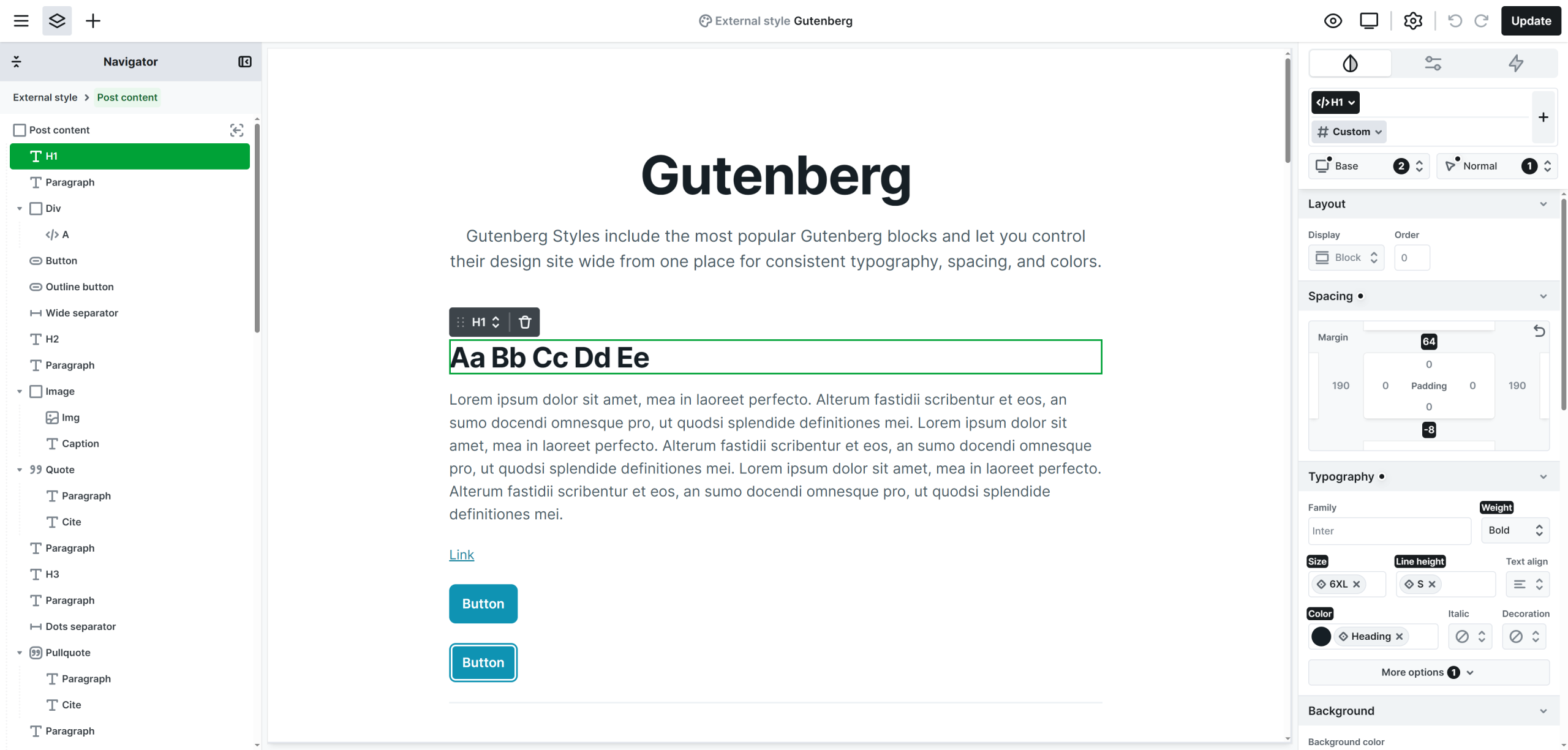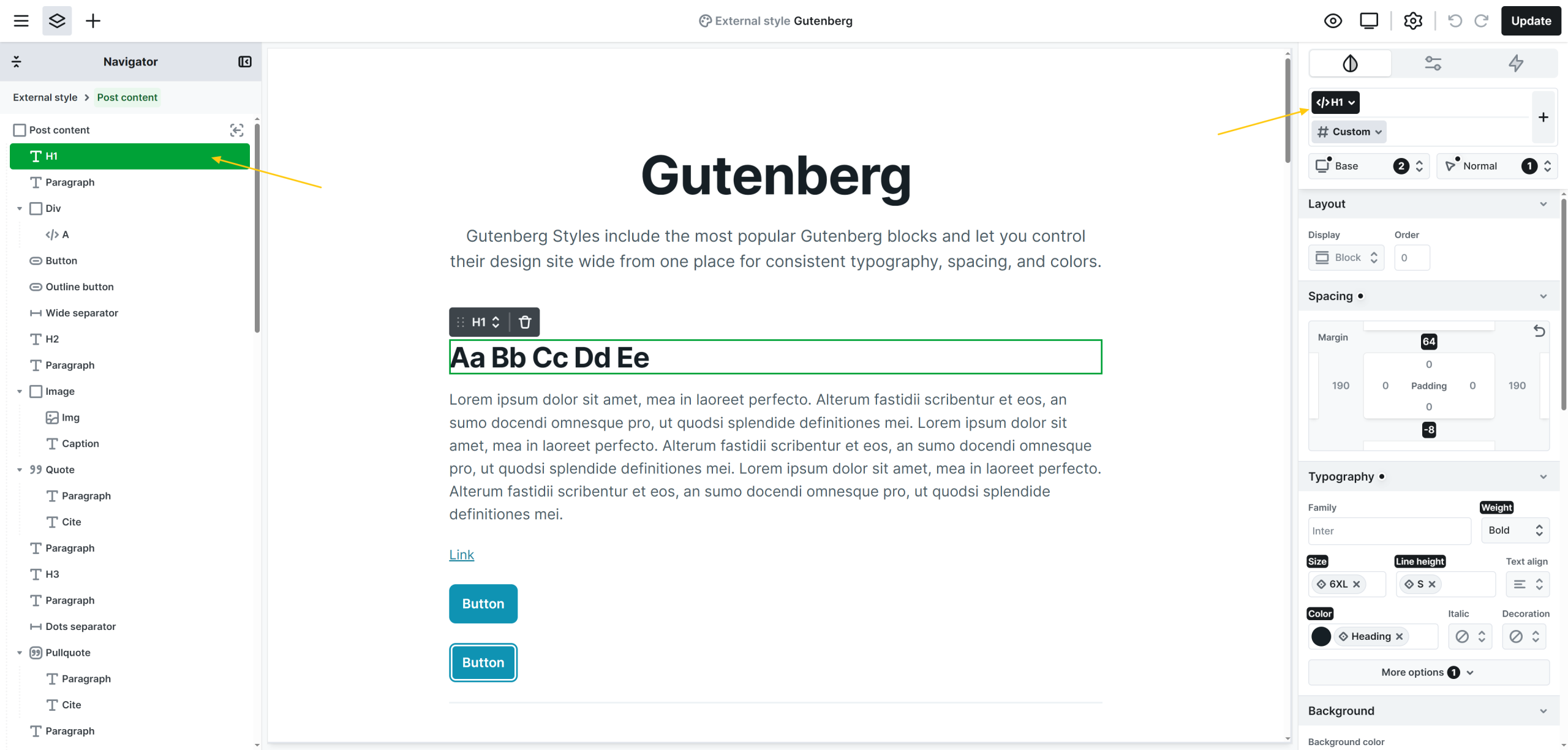 Within the Gutenberg styles, you’ll find a few elements that are not available on other editor pages. These elements exist specifically to support global styling and design consistency.