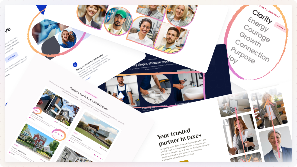 As one of the more artistic website layout designs, overlaying elements brings depth and layering to your site. This layout stacks text, images, and different elements to create an artistic feel. It’s perfect for adding a playful touch to your website.