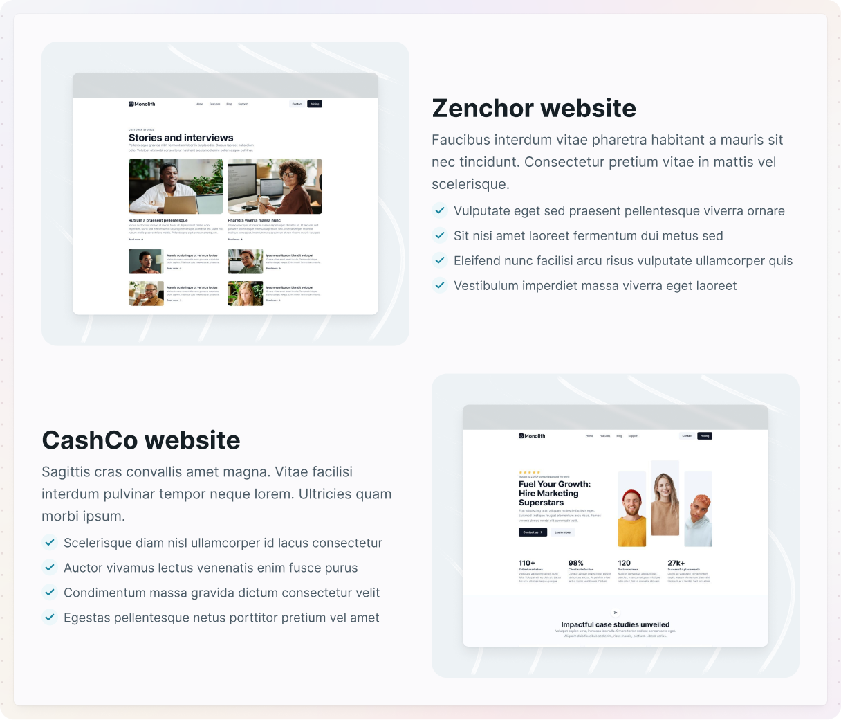 This is one of the most dynamic website layout examples, ideal for content that needs rhythm and flow. The zig-zag layout of your content leads readers’ eyes smoothly from one side of the page to the other. It’s great for organizing information into sections so they are easier to understand.