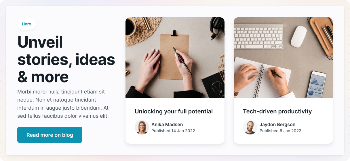 In this example, we’re working with the Hero 11 block in Monolith. The design includes a grid setup that has two columns. Just like in some earlier website layout examples, the left column is a bit slimmer compared to the right one, which is achieved by using the ‘5+7’ subclass.