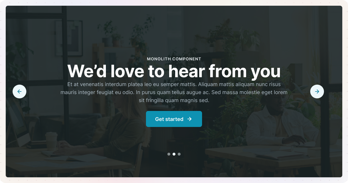 This example uses the Hero 20 block in Monolith, which is all about having a nice and structured look. The container is set up in a grid format with three equal columns, each sharing the available space equally. Plus, to ensure everything feels balanced, there’s a consistent gap between the columns.