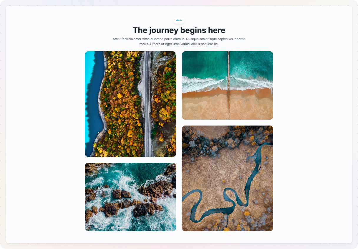 In this example, we are using the Media 07 block in Mosaic. This section has two containers: one for the text and another for the image layout. The images are arranged inside a Container that’s split into two columns. Each column holds a row, and the images are simply stacked one below the other. Because the images come in different sizes, the stacking automatically creates that staggered, masonry-style look, no complex setup needed.